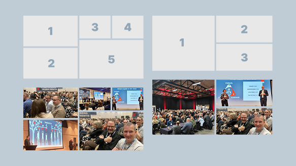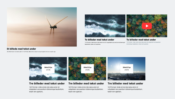 - Billeder i 16:9 format, dynamisk højde eller i firkantet format.