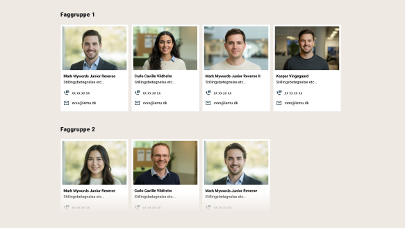 Med Contact Cars blok kan man vise et udvalg af personer inddelt i faggrupper med mail, stillingsbetegnelse, link og telefonnummer.