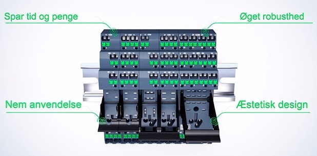 De nye sokler har nøjagtig samme montagehøjde på DIN-skinnen, hvilket giver et pænt udseende i tavlen, samtidig med at det gør det muligt at forbinde soklerne ved hjælp af den 2-polede laske, der nemt monteres i bunden af soklen.