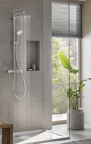 Afslapning eller energiboost? GROHES Euphoria brusesystem er spækket med funktioner, som gør brusebadet til et af dagens højdepunkter. Vandforbruget holder sig til gengæld på et lavt niveau.