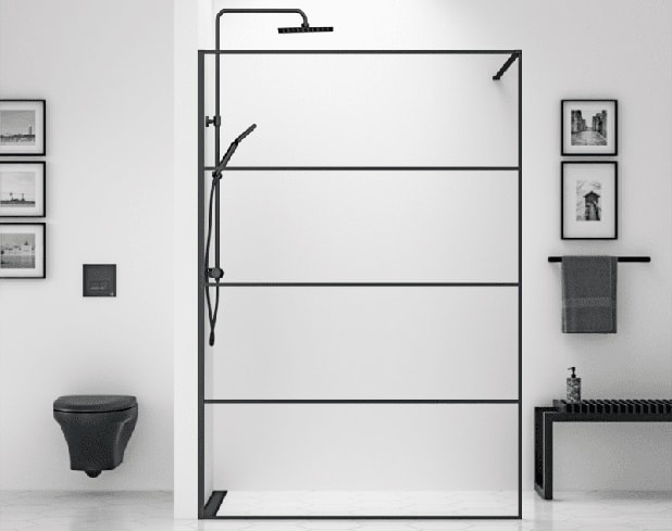 De slanke, sorte profiler løber horisontalt på ydersiden af glasset, så brusevæggen er nem at holde ren på indersiden. Du undgår nemt kalkaflejringer ved at skrabe den af, hver gang du har været i bad.
