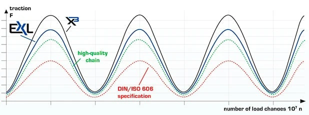 Et andet unikt træk ved EXL-kæderne er den brede taljepladegeometri, der bidrager til en højere træthedsstyrke og slidstyrke. Dette er vigtigt i krævende miljøer, hvor kæderne skal kunne håndtere store belastninger uden at svigte.