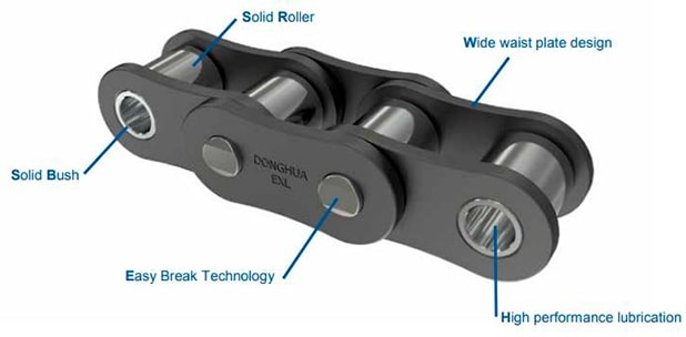 Derudover kommer kæden med Donghua´s innovative Easy-Break-teknologi i EXL-serien, hvilket gør kæderne ekstremt nemme at adskille. Dette kan spare tid og ressourcer – især under vedligeholdelse og reparation.