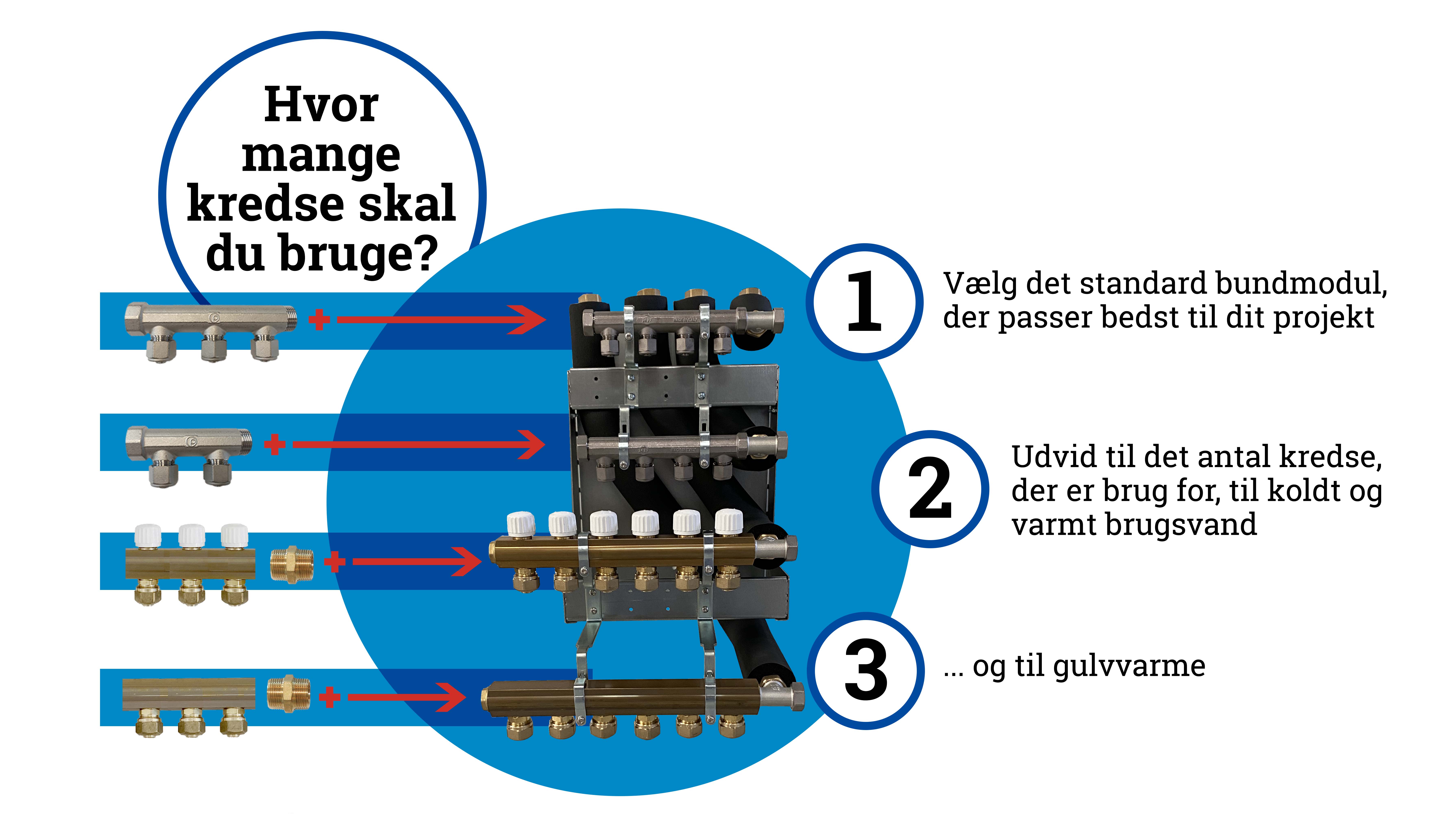Et standardbundmodul konfigureres med 5 eller 6 gulvvarmekredse, 5 koldtvandskredse og 3 varmtvandskredse, men kan udvides efter ønske og det giver den fleksibilitet, som VVS-installatøren har brug for. Skræddersyede løsninger med hensyn til antal kredse, både for gulvvarme og for brugsvand, gør at bundmodulet kan konfigureres efter det specifikke behov.