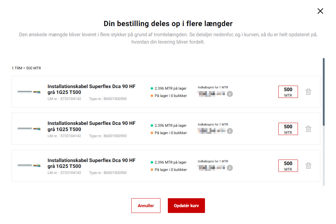 Når du bestiller kabler på tromler, informerer vi dig, hvis leveringen sker i flere længder – f.eks. hvis vi kun kan levere på flere tromler. Du får beskeden i en pop-up før du lægger varen i kurven.