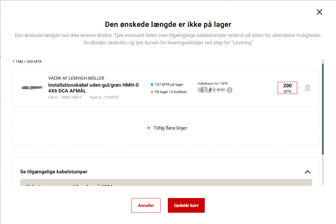 Eksempel: Bestiller du 500 meter, men vi mangler præcis den længde, får du besked – sammen med visning af tilgængelige kabelstumper.