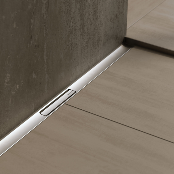 Vandlåsen er konstrueret til at håndtere fuld vandmængde og er selvrensende. Kun dækslet kræver opmærksomhed: Den integrerede hårsi åbnes med et fingertryk for hurtig rengøring. Designmæssigt kan renden placeres op mod væggen eller med afstand – og den fås i klassisk børstet rustfrit stål eller elegant sort.