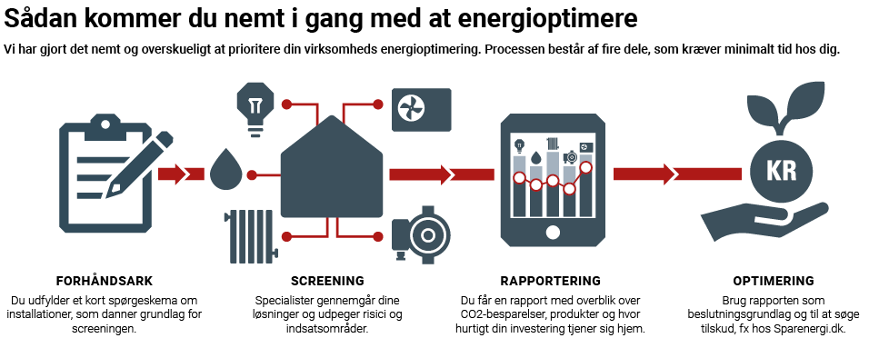 Vi hjælper med alt fra (gratis) screening af din bygning til rapportering på optimeringsmuligheder og valg af de rigtige produktløsninger.