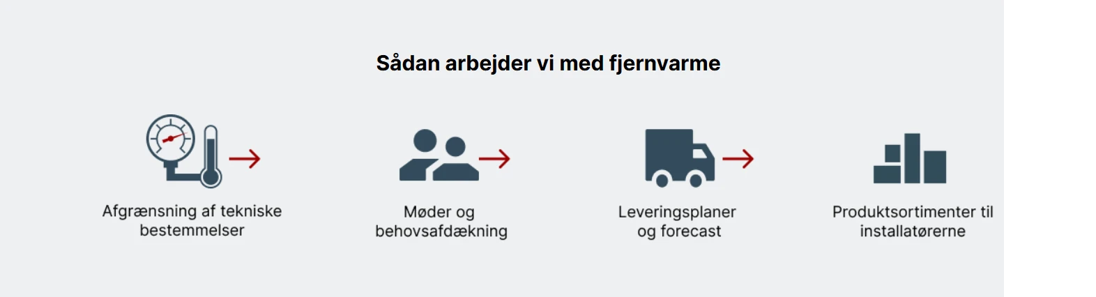 Vi sætter os ind i den konkrete varmeplan og tekniske bestemmelser for det enkelte fjernvarmeværk og leverer fjernvarmeunits samt tilhørende produkter, der lever op til gældende krav og betingelser.