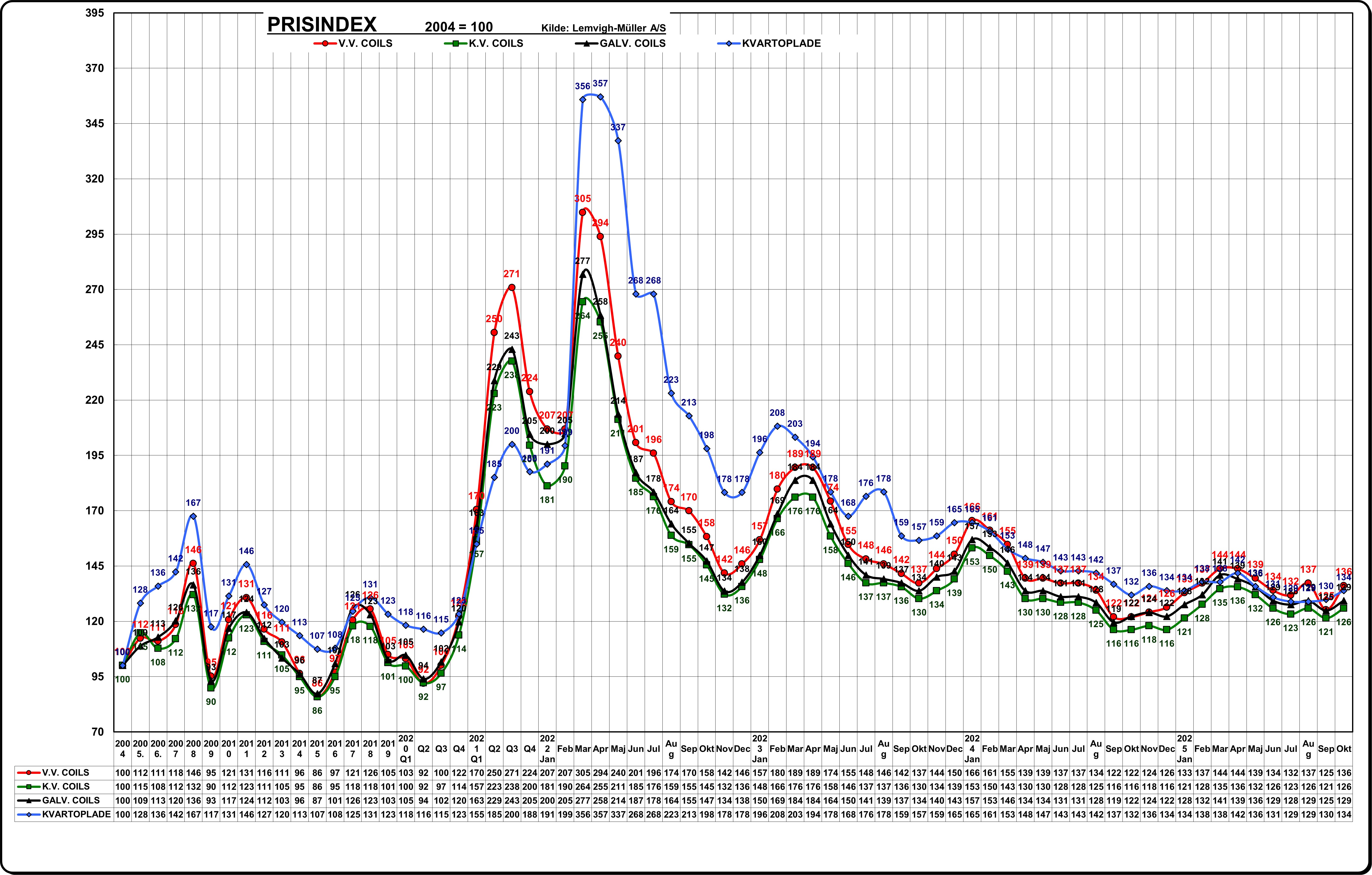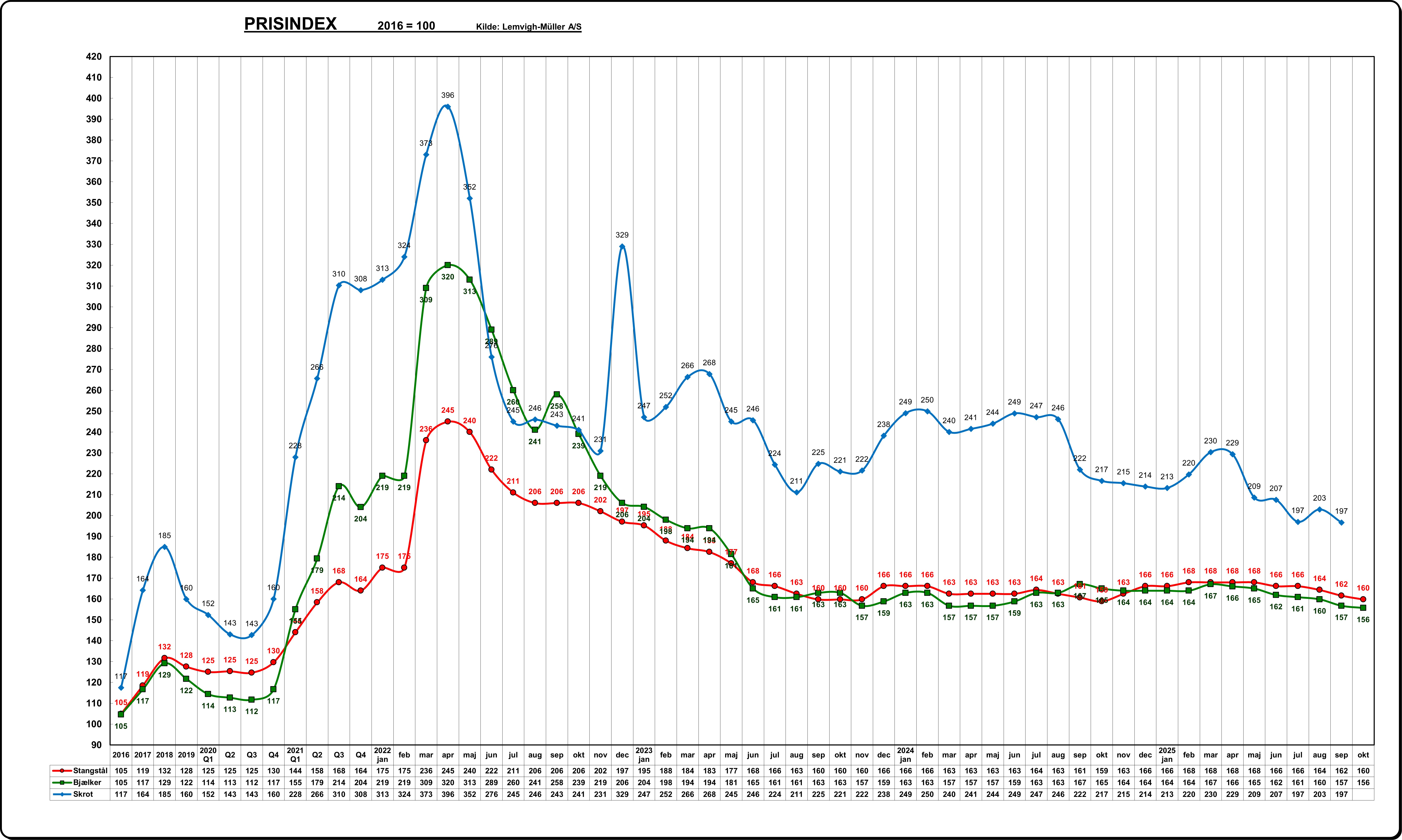 I oktober har priserne på lange stålprodukter stabiliseret sig, og vi forventer, at denne tendens fortsætter resten af året. Udviklingen skyldes primært en stabilisering af skrotpriserne samt stålværkernes delvise succes med at tilpasse kapaciteten til den aktuelle efterspørgsel.