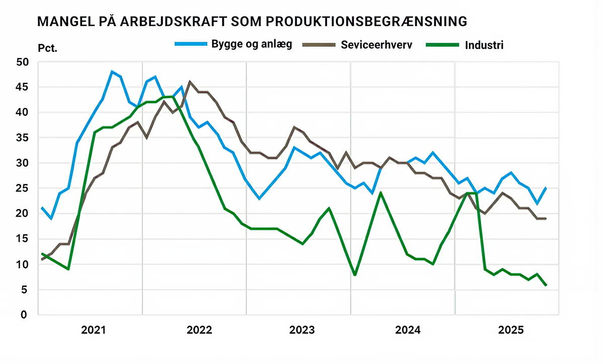 Ifølge Danmarks Statistik melder 25 pct. af anlægsentreprenører om mangel på arbejdskraft i år. Det er betydeligt lavere end tidligere år, men mange af vores kunder i både byggeriet og industrien oplever stadig udfordringer med rekruttering, aldersafgang og sygefravær. Virksomhederne vurderer desuden, at de manglende hænder på byggepladserne og i produktionen hæmmer deres potentielle vækst.