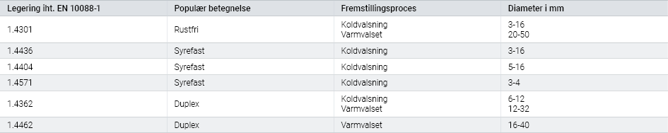 Da der i dag ikke findes nogen fælles europæisk standard, er det vigtigt, at der oplyses om kvaliteten i forbindelse med forespørgsel eller ordre. Vores underleverandør er certificeret til at fremstille produkter iht. britisk standard BS6744. Den mest anvendte kvalitet i rustfast armeringsstål er 1.4301.