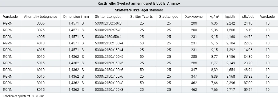- B500B, på forespørgsel kan undersøges om leverandør kan finde stål, der opfylder kravene til B550B