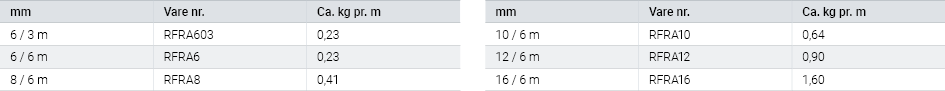 Lemvigh-Müller lagerfører rustfrit ribbet armeringsstål i kvalitet 1.4301 iht. EN 10088. Fra vores lager kan vi levere 6-16 mm i længder á 6 m. Andre dimensioner eller kvaliteter samt armeringsnet kan skaffes ved forespørgsel.